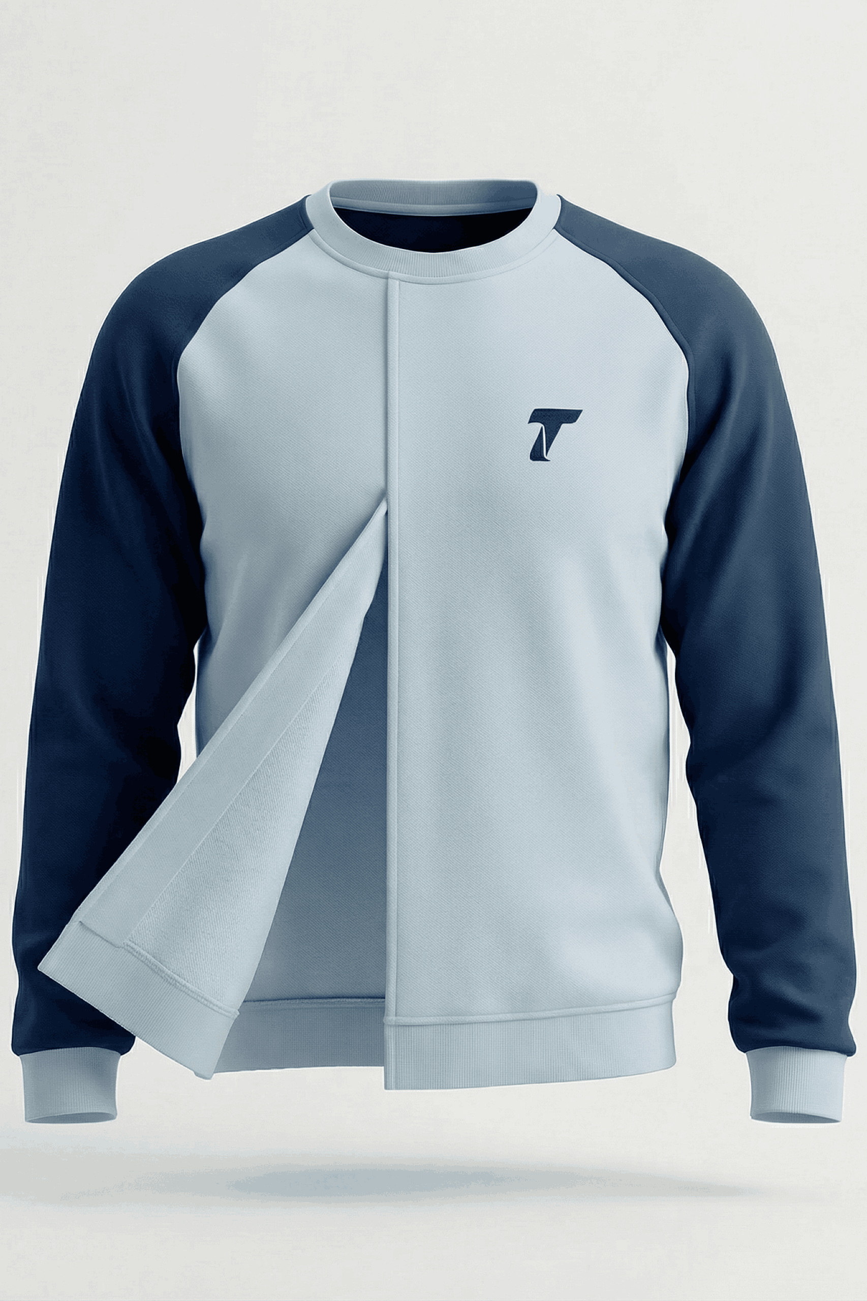 The Twistan Flowseam Sweatshirt  is two-tone, color-block contrasts the sleeves and body in complementary blue shades, making this a versatile piece that pairs well not only with the pieces from our current drop, but also with looks from previous drop. The outer center sleeve features an inverted box pleat, introducing a sculptural edge to the design. Cut with a straight body, the design has a center front slit-like opening that lends the sweatshirt a subtle architectural edge. This detail transforms the Flowseam Sweatshirt into a layering essential, allowing the wearer to reveal and highlight garments beneath as well as elevating the overall look. Both easy-going and modular, it bridges everyday comfort with modern styling.